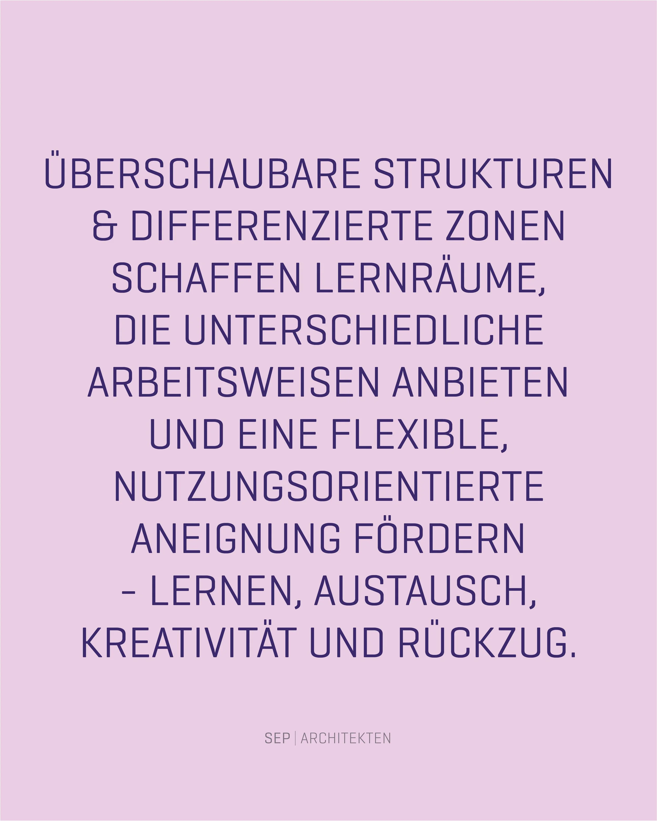 Lernen verstehen wir dabei nicht als festen Zustand, sondern als Bewegung: zwischen Rückzug und Gemeinschaft, Konzentration und Austausch, Sitzen, Stehen, Liegen und Begegnen. Räume werden zu Angeboten - mit unterschiedlichen Atmosphären, Maßstäben, Lichtstimmungen und Materialien - die individuell angenommen, verändert und angeeignet werden dürfen. Architektur gibt Struktur, ohne festzulegen, und eröffnet Offenheit, ohne Orientierung zu verlieren. Der Raum wird so selbst zum aktiven Teil des Lernens.